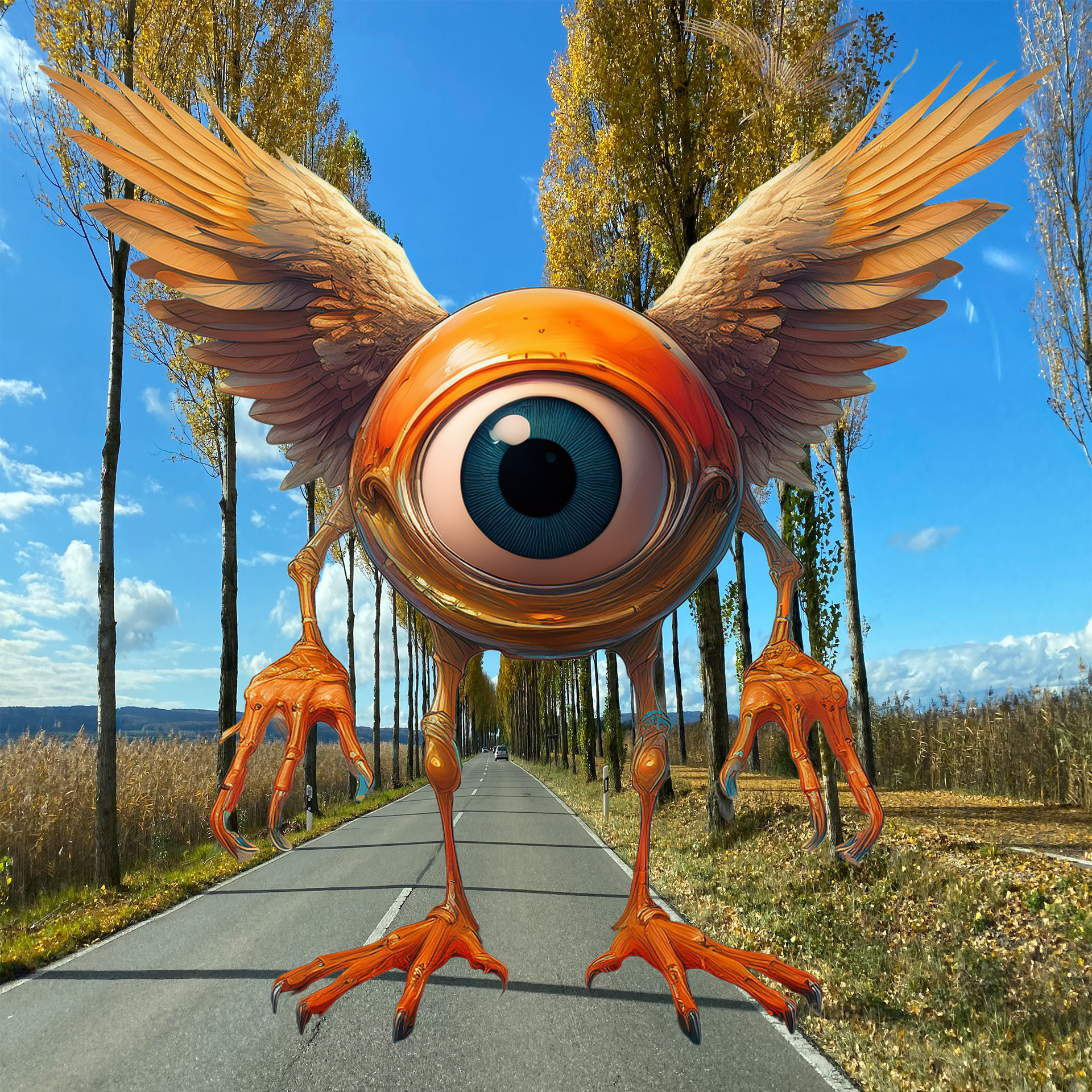 Ein riesiges, orangefarbenes Augapfelwesen mit Flügeln und Vogelbeinen steht auf einer Straße, zwischen Bäumen und blauem Himmel.